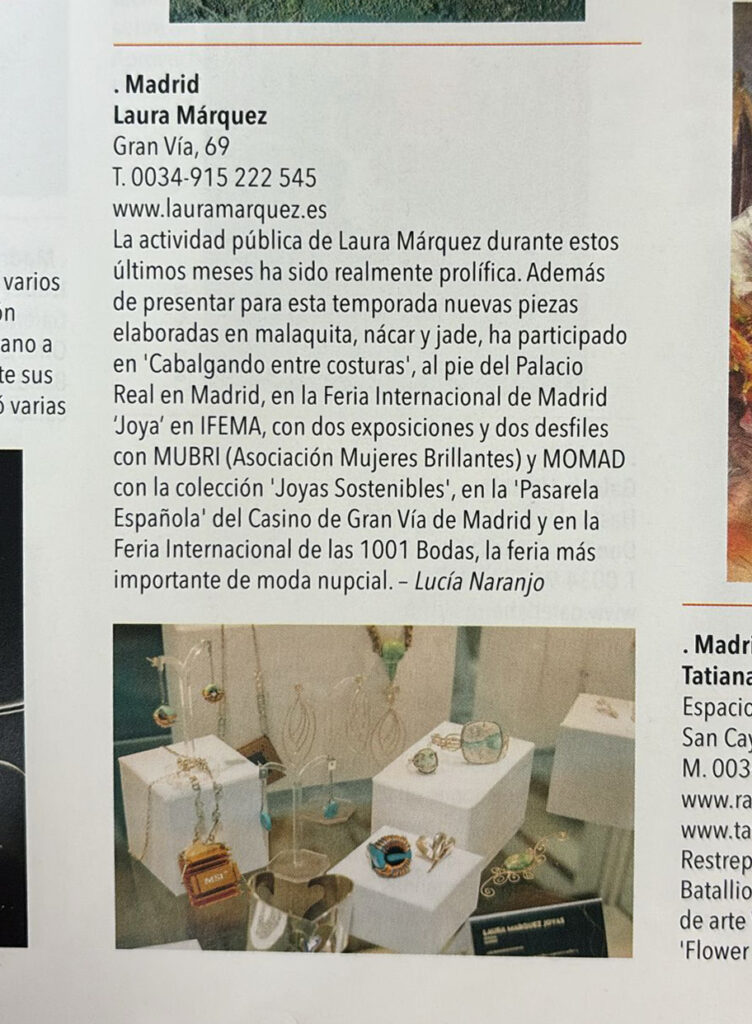 «La actividad pública de Laura Márquez durante estos últimos meses ha sido realmente prolífica. Además de presentar para esta temporada nuevas piezas elaboradas en malaquita, nácar y jade, ha participado en ‘Cabalgando entre costuras’, al pie del Palacio Real en Madrid, en la Feria Internacional de Madrid ‘Joya’ en IFEMA, con dos exposiciones y dos desfiles con MUBRI (Asociación Mujeres Brillantes) y MOMAD con la colección ‘Joyas Sostenibles’, en la ‘Pasarela Española’ del Casino de Gran Vía de Madrid y en la Feria Internacional de las 1001 Bodas, la feria más importante de moda nupcial.»