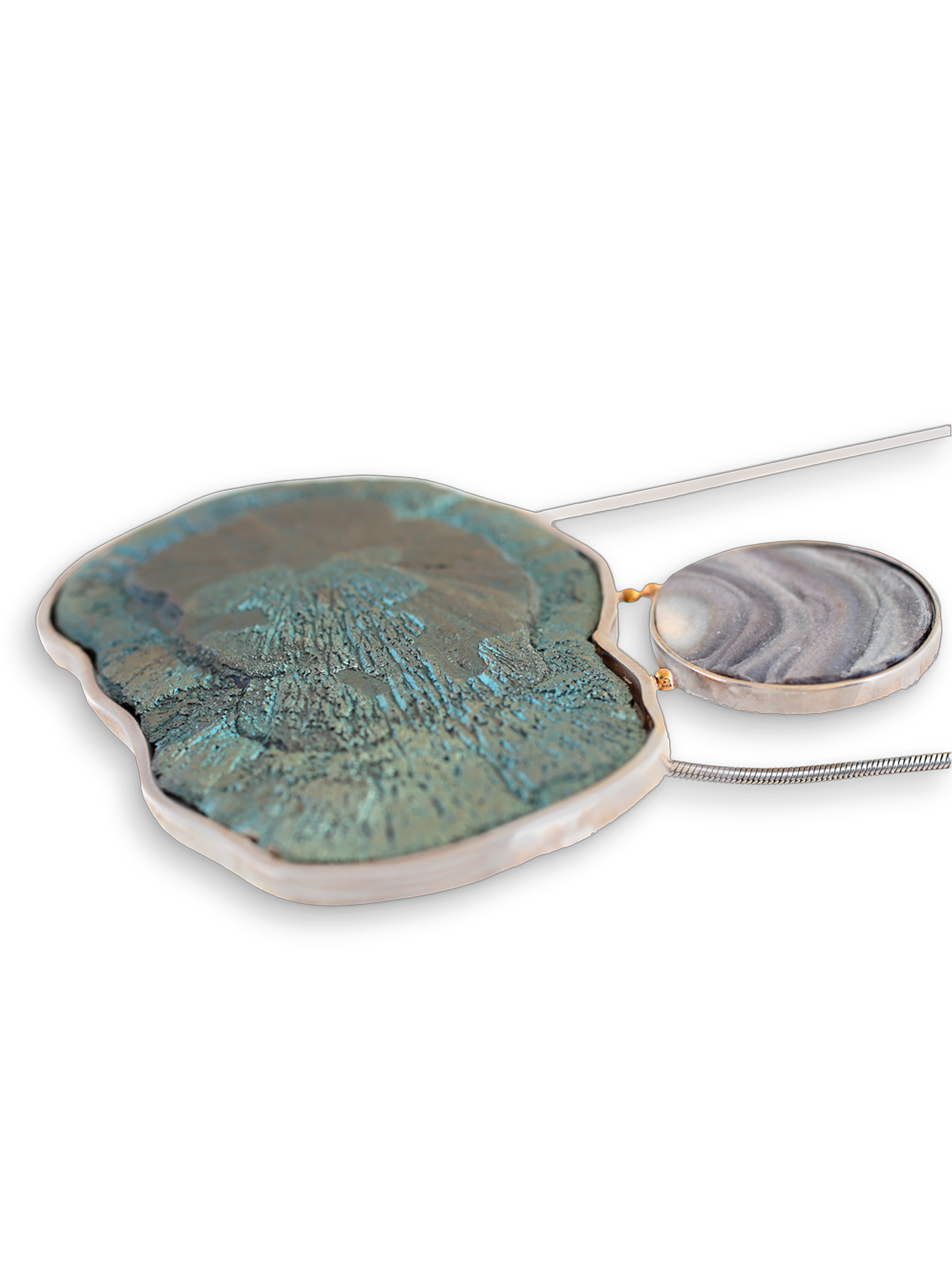 Las creaciones destacan por la incorporación magistral de piedras y minerales como el Ámbar, la Aguamarina, la Pirita o la Blenda-Esfalerita. Cada colgante es una obra maestra única, con formas que evocan la gracia de las mariposas y representaciones artísticas del mundo que reflejan la maestría y la visión creativa de la artista. La fusión de minerales preciosos con la elegancia de las formas seleccionadas revela la habilidad de Laura Márquez para transformar cada pequeño tesoro de la naturaleza en verdaderas obras de arte, invitando a los espectadores a sumergirse en un universo de belleza y significado.