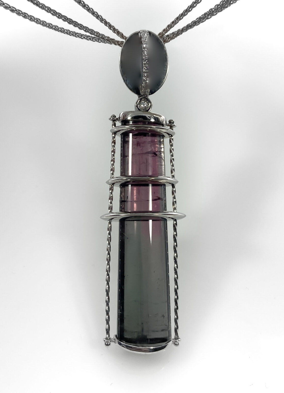 Colgante inspirado en el faro más alto de Japón y el segundo del mundo con 106m de altura en una construcción cónica. Está realizado a mano en oro blanco rodinado de 18kt sujetando una preciosa turmalina con marcado tricroismo que va del gris al rosa con 32,5ct y un total de brillantes con 0,15ct.