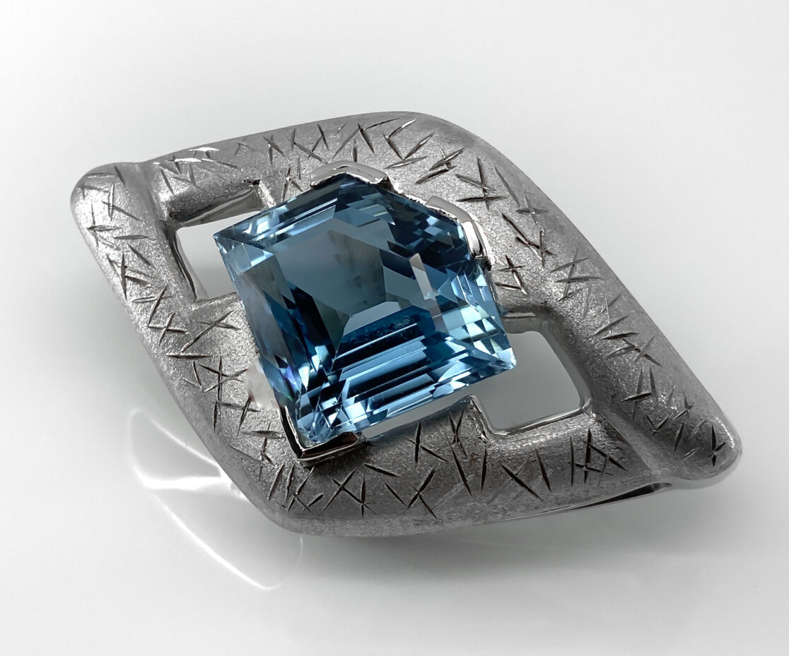 Oro blanco de 18kt con acabado mate y rayado en brillo. La piedra es un topacio azul de 39,23 ct.