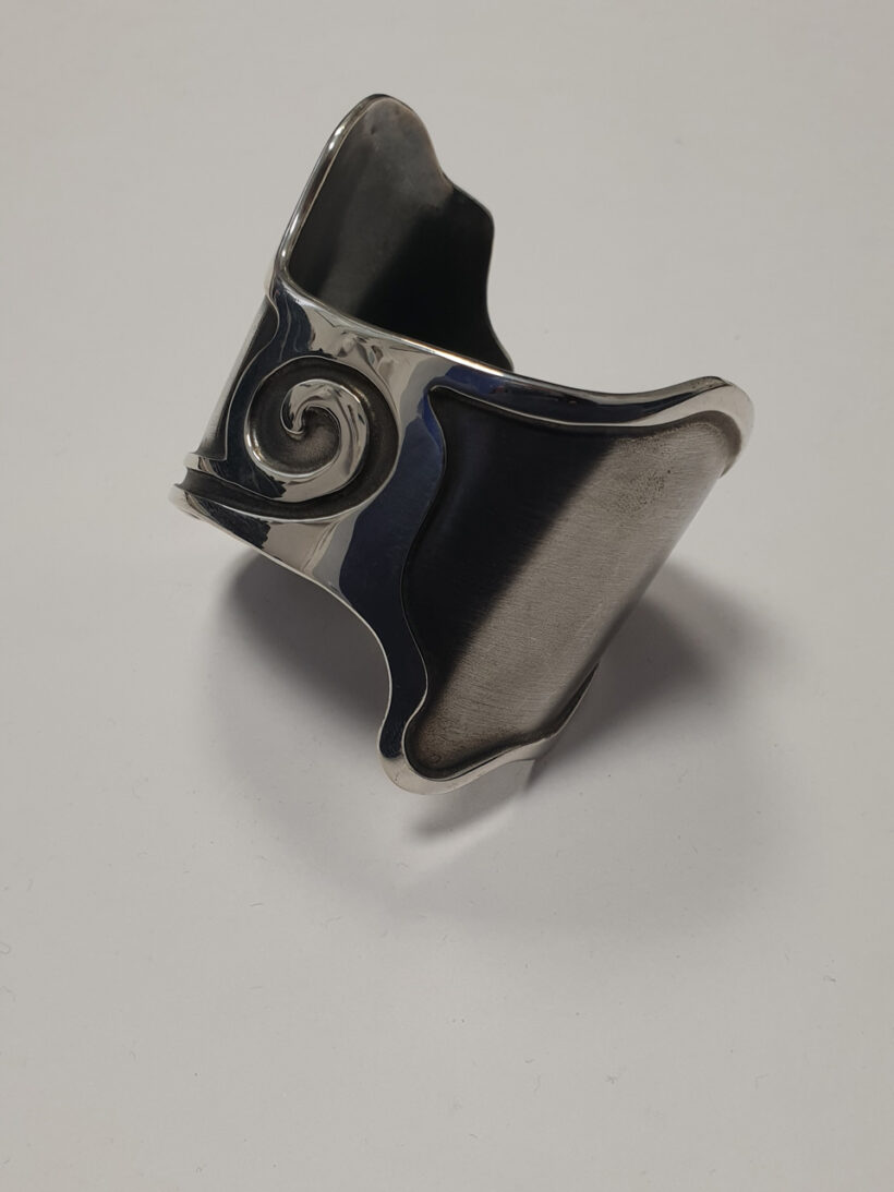 Brazalete «Espiral» en Plata con pátina, realizado a mano. Expuesto Museo de Historia de Madrid.