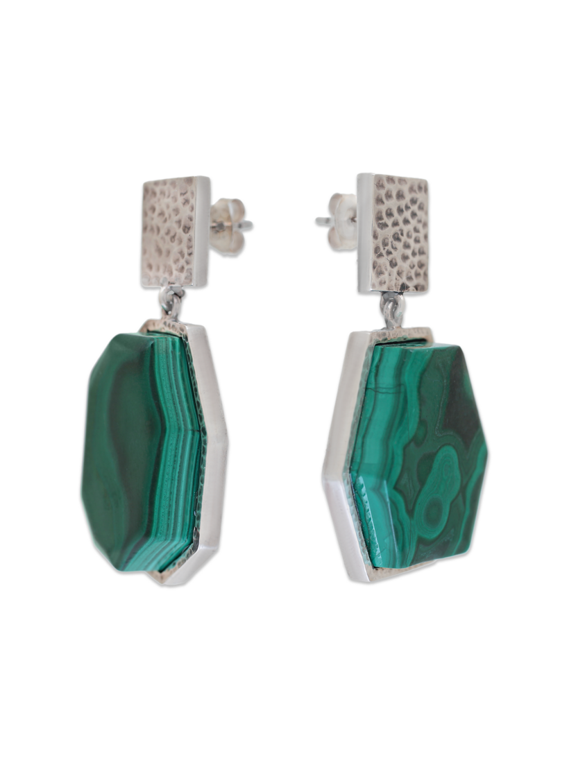 Pendientes en plata de de 1ª Ley y acabado texturizado con dos malaquitas poligonales. Cierre a presión.