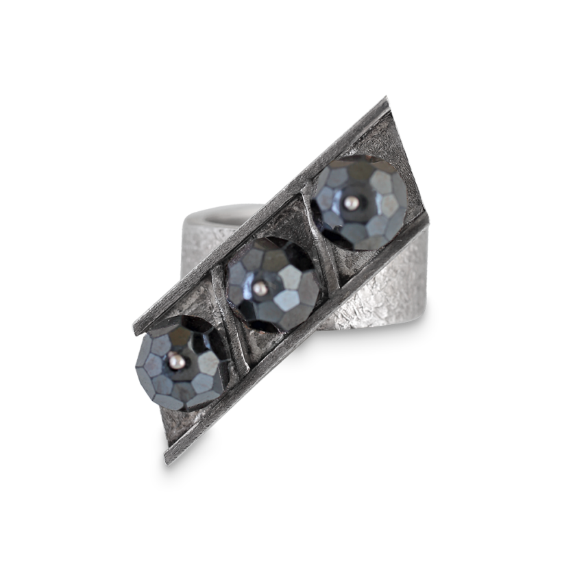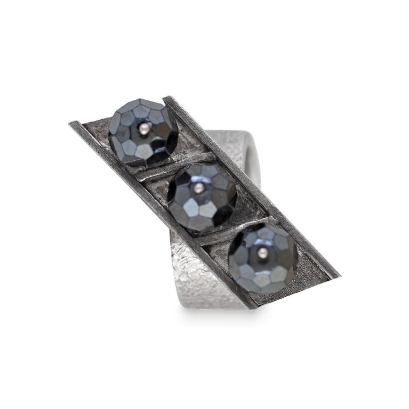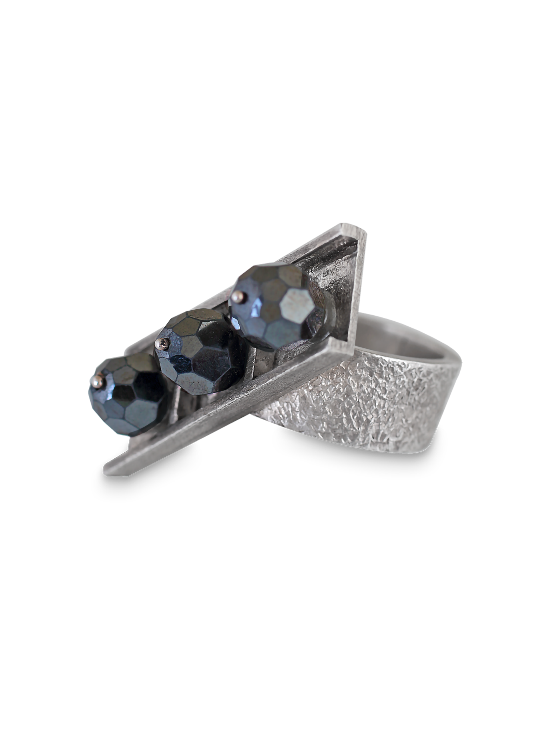 Sortija en Plata de 1ª Ley con textura Martelé mate, con tres Hematites.